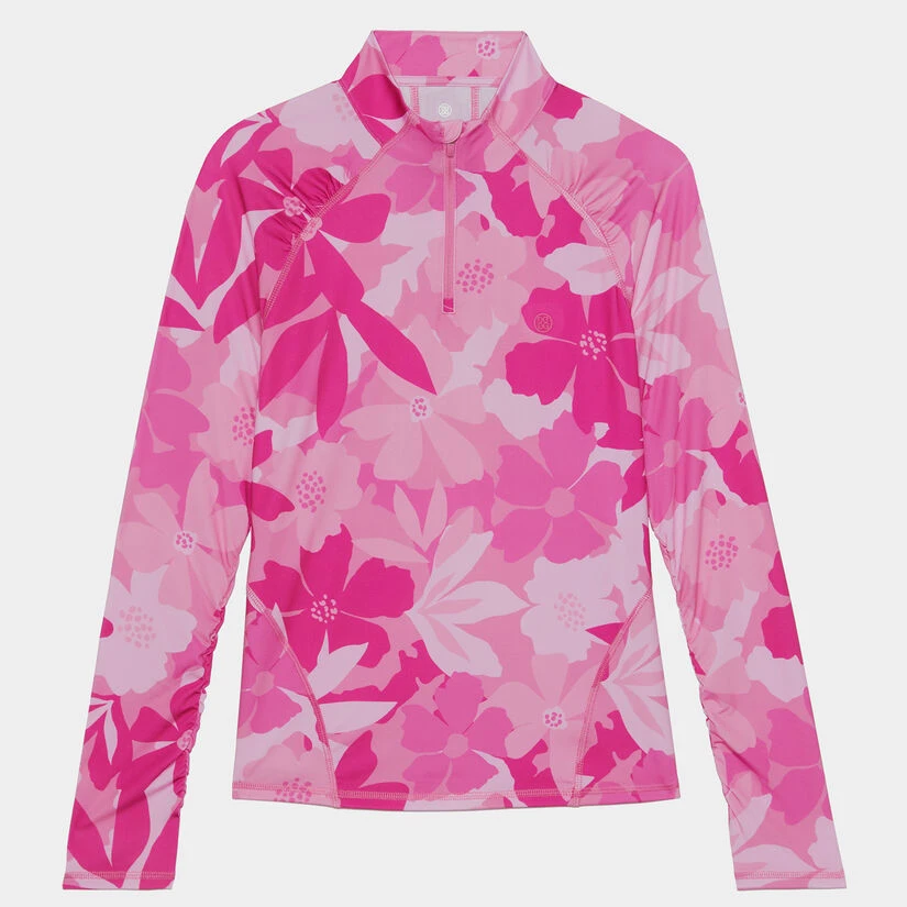SHOW OFF YOUR COMFORT AND STYLE WITH THE FLORAL CAMO TECH JERSEY QUARTER ZIP PULLOVER. THIS STANDOUT LAYERING PIECE IS MADE WITH TECH JERSEY FABRIC AND FEATURES A TONAL FLORAL PRINT THROUGHOUT. PLUS, ROUCHING AND CONTRAST STITCHING PROVIDE A FLATTERING CONTOUR EFFECT AS AN ADDED PERK. G4LS23K565A