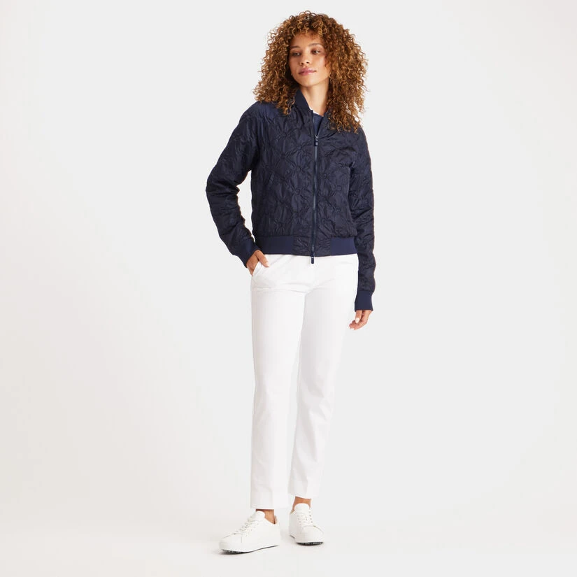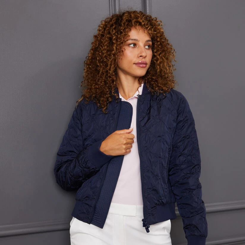 SUPER STYLISH, THIS LIMITED EDITION BOMBER STYLE JACKET IS MADE WITH UNIQUE EMBOSSED NYLON FILLED WITH DOWN-FEEL THERMAL INSULATION FOR EXTRA WARMTH. PERFECT FOR WINDY DAYS ON THE COURSE OR COLD NIGHTS OUT ON THE TOWN. G4LS23O59